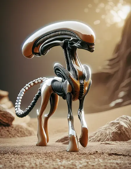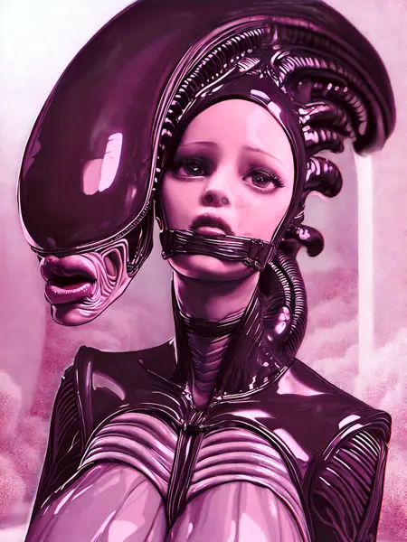 H.R.ギーガーの芸術的スタイルは、バイオメカニカルな要素、シュルレアリズム、暗く異世界的なイメージの独自な融合を特徴としています。彼の作品には、シュルレアリスティックな風景、バイオメカニカルな生物、不気味でエロティックなテーマを繊細かつ高度に詳細に描いたものがよく見られます。ギーガーの芸術は、暗く心に残る雰囲気で有名であり、エアブラシや点描などの技法を用いることで、作品に深みと質感を与え、不気味さを増しています。全体として、彼のスタイルは明らかに独自であり、不気味さと異様さを喚起します。