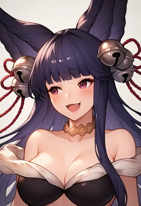 1girl, yuel_\(granblue_fantasy\), erune, fox_ears, hair_bell, fox_tail, jingle_bell, red_eyes, large_breasts, black_hair, long_hair, very_long_hair, bare_shoulders