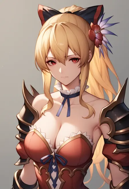 1girl, vira_\(granblue_fantasy\), blonde_hair, long_hair, red_eyes, hair_bow, cleavage, large_breasts, ponytail, bare_shoulders, hair_between_eyes, official_alternate_costume, navel, hair_flower