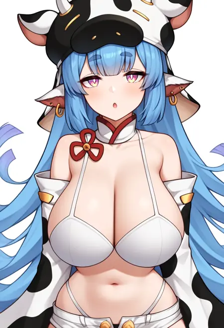 1girl, catura_\(granblue_fantasy\), draph, cow_ears, blue_hair, large_breasts, cow_print, long_hair, cleavage, cow_horns, cow_hat, cow_girl, detached_sleeves, ear_piercing, navel, pointy_ears