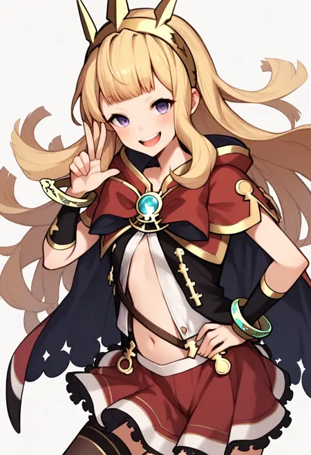 1girl, zeta_\(granblue_fantasy\), blonde_hair, blue_eyes, long_hair, twintails, hair_intakes, large_breasts, cleavage, hairband, braid, navel, hair_ornament