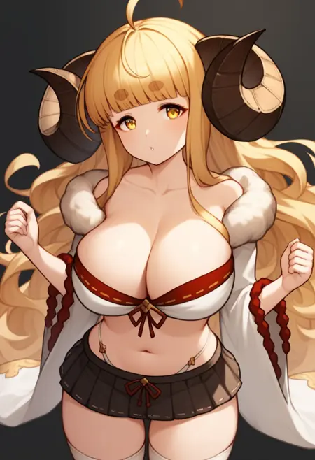 1girl, anila_\(granblue_fantasy\), draph, blonde_hair, large_breasts, ahoge, yellow_eyes, sheep_horns, thick_eyebrows, cleavage, very_long_hair, short_eyebrows, blunt_bangs, navel, long_hair, curled_horns