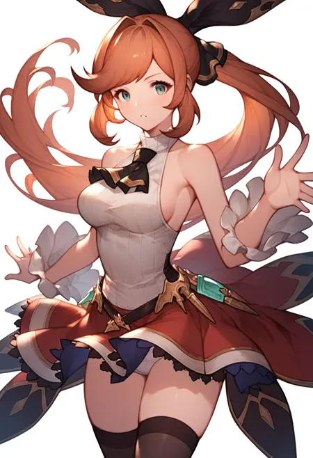 1girl, clarisse_\(granblue_fantasy\), green_eyes, long_hair, ponytail, orange_hair, hair_ribbon, brown_hair, medium_breasts, black_gloves, bare_shoulders, black_thighhighs