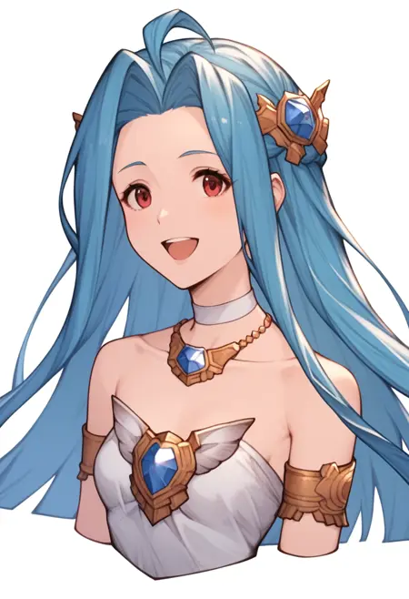 lyria_\(granblue_fantasy\), 1girl, blue_hair, blue_eyes, very_long_hair, ahoge, white_dress, bare_shoulders, collarbone, small_breasts, choker