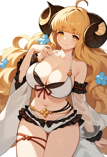 1girl, anila_\(granblue_fantasy\), anila_\(summer\)_\(granblue_fantasy\), draph, blonde_hair, official_alternate_costume, sheep_horns, large_breasts, ahoge, yellow_eyes, cleavage, white_bikini, short_eyebrows, very_long_hair, navel, thick_eyebrows