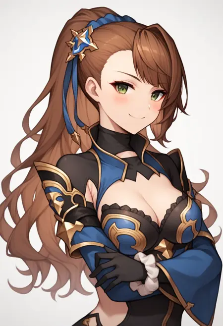 beatrix_\(granblue_fantasy\), 1girl, brown_hair, long_hair, large_breasts, ponytail, cleavage, brown_eyes, navel, bare_shoulders, green_eyes