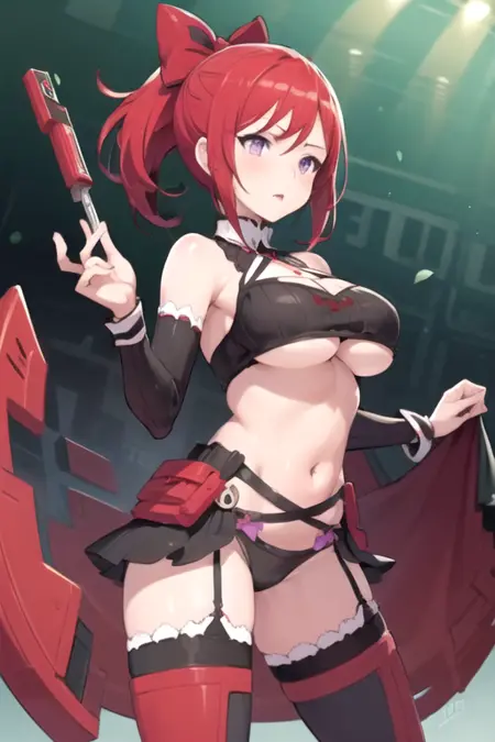 ChloeBattle, 1girl, solo, large breasts, thighhighs, hair bow, navel, cleavage, purple eyes, panties, ponytail, red hair, underboob, garter straps