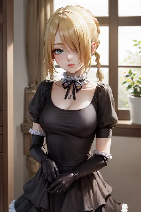 トリガー+衣装: hilda (beelzebub), メイド服, 黒の肘先グローブ, チョーカー, 黒の靴, 膝丈ブーツ