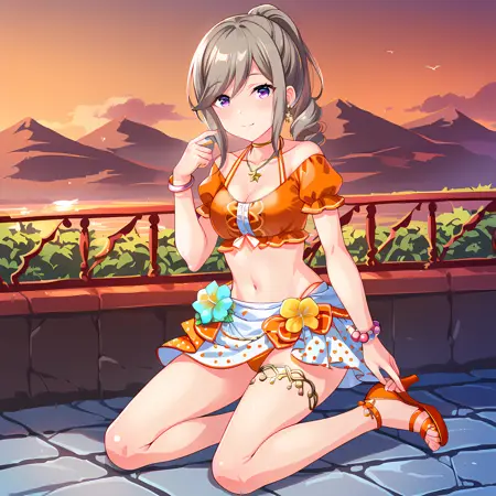 shiraishi2, shirshsw2 necklace, shirshsw2 bracelet, shirsw2 crop top, shirsw2 bikini skirt, ponytail, flower ornament, shirshsw2 thighlet, shirshsw2 strappy heels,