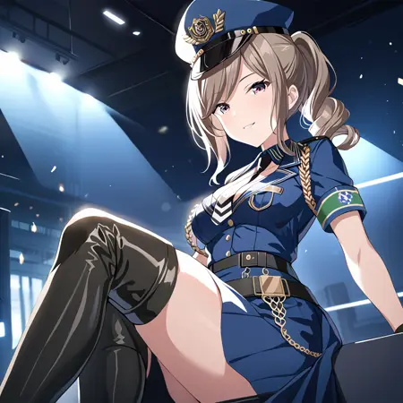 shiraishi2, police2 hat, police2 uniform, police2 high boots, police2 necktie, ponytail, police2 gloves,