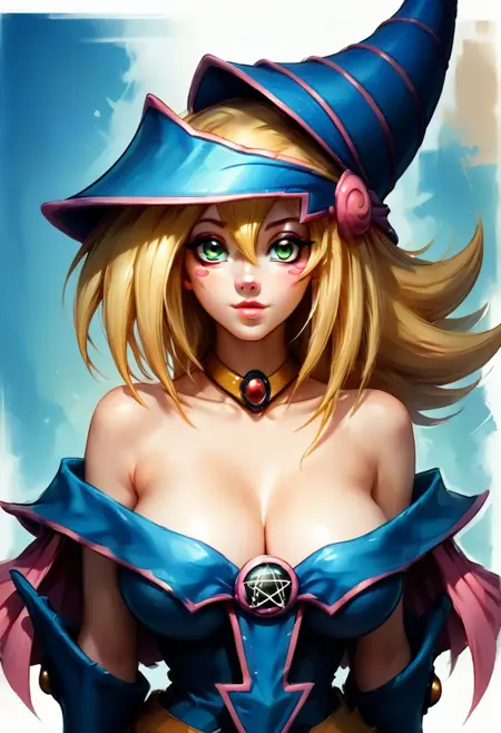 提示词激活器:dark magician girl(/Yu-Gi-Oh!)/,(ultra HD quality details), pale skin, blonde hair, green eyes, long hair,
