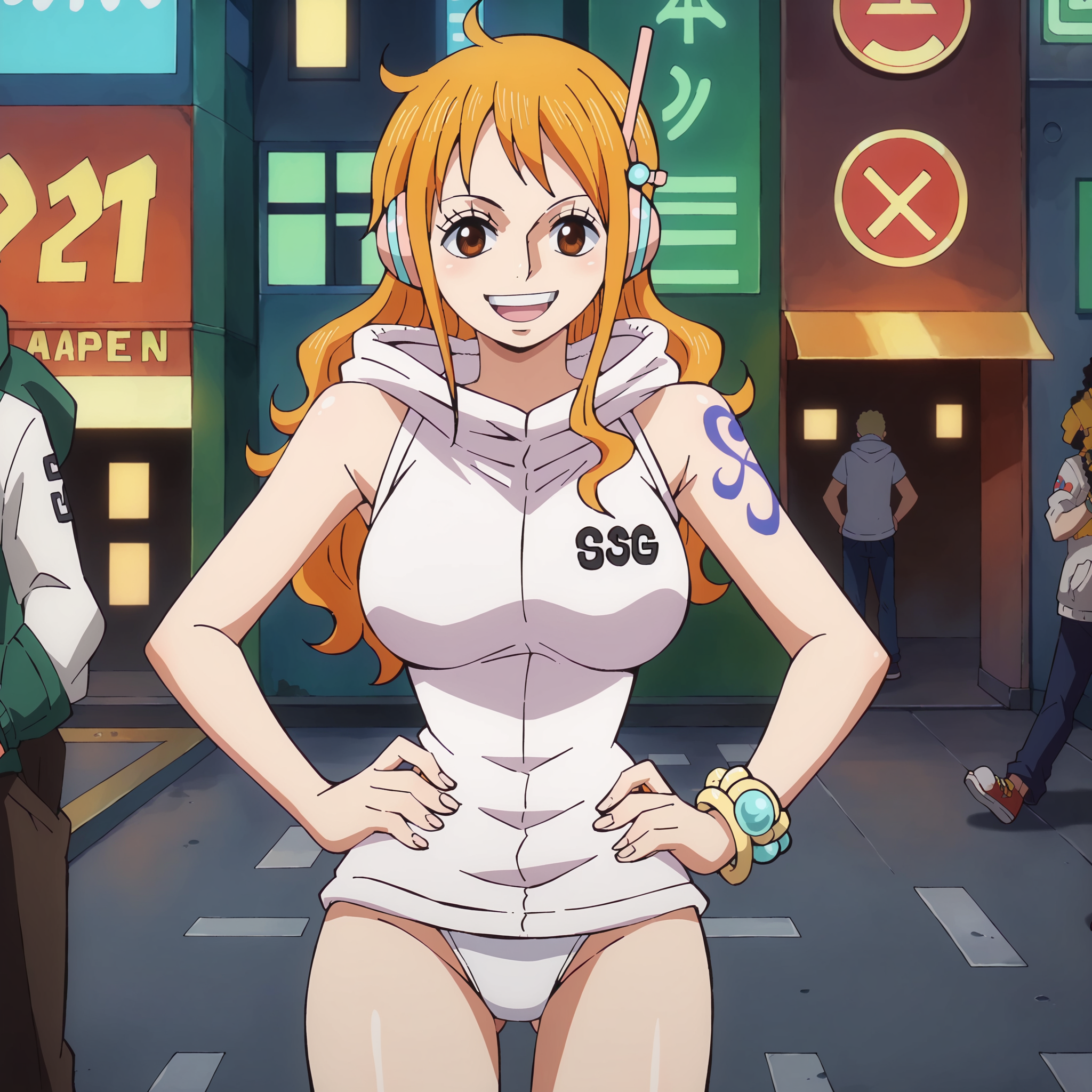 nami_egghead, orange hair, long hair, wavy hair, side locks, brown eyes, large breasts, shoulder tattoo