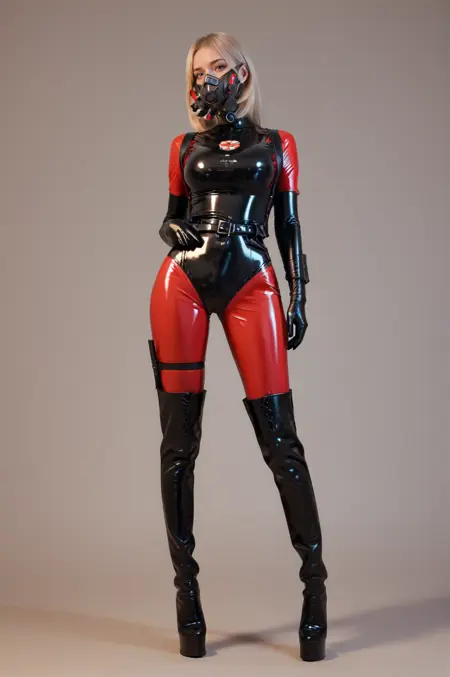 latex bodysuit,black bodysuit,red bodysuit,thigh boots,belt,thigh strap,mask,respirator