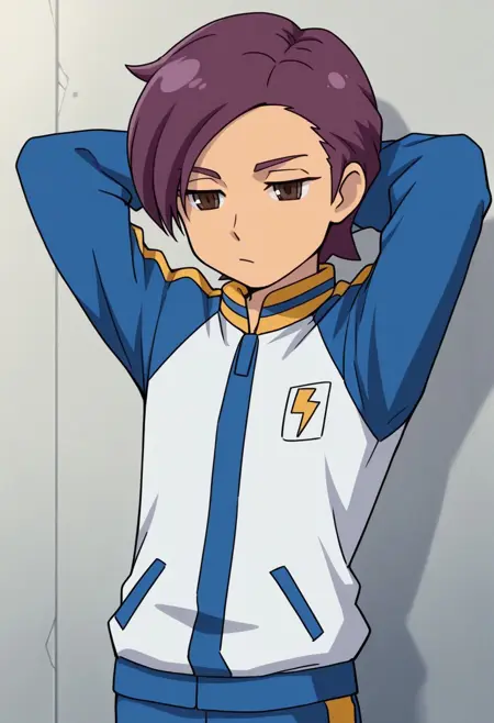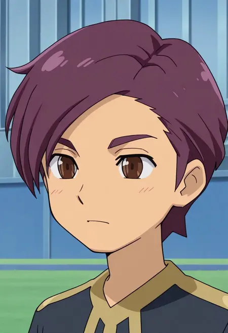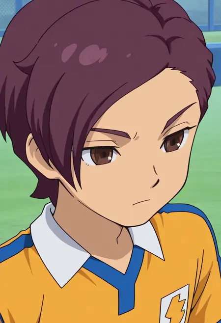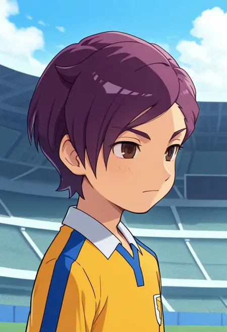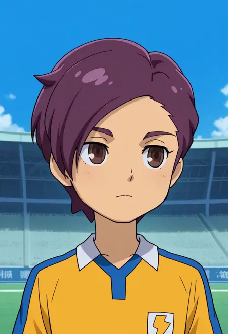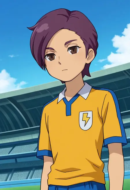 MinamAtsu, 1boy, male focus, solo, 棕色眼睛, 紫色头发, 雷门足球服, 上衣, 黄色上衣, 短袖, 闪电标志, 短裤, 蓝色短裤, 袜子, 蓝色袜子, 鞋子, 运动鞋,