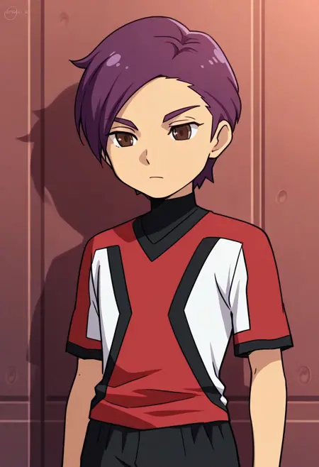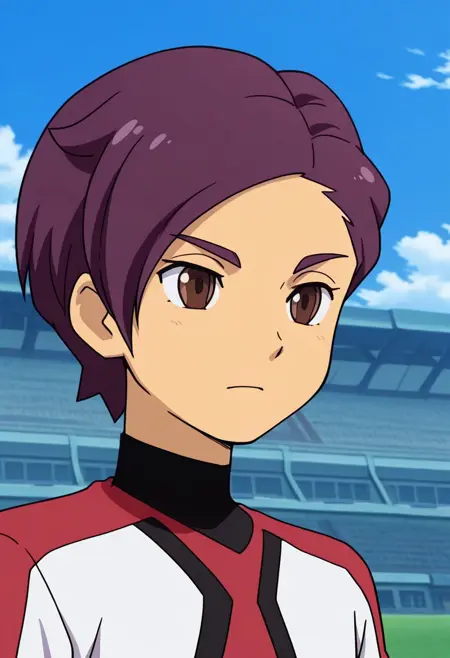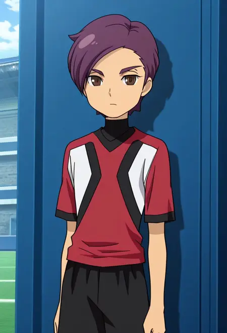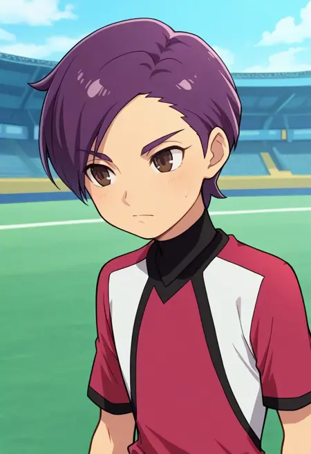 MinamAtsu, 1boy, male focus, solo, 棕色眼睛, 紫色头发, 抗争足球服, 高领, 多色上衣, 短裤, 黑色短裤,