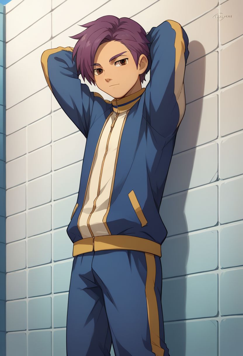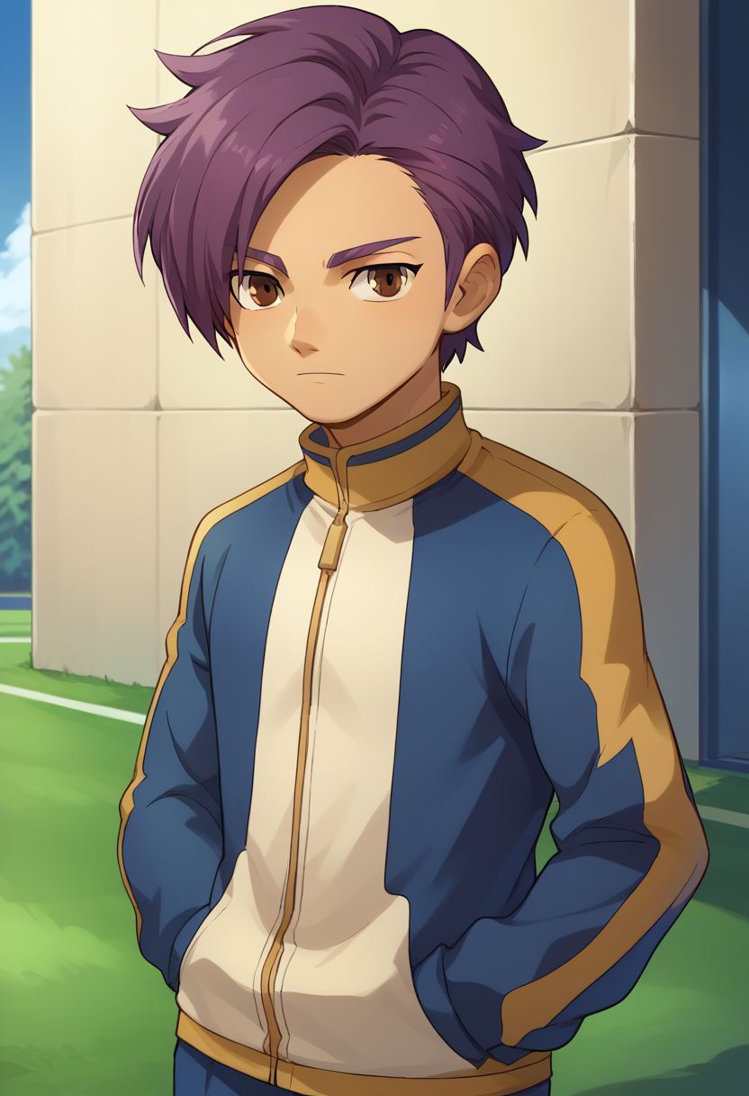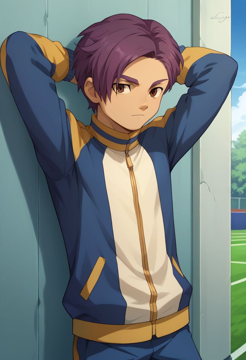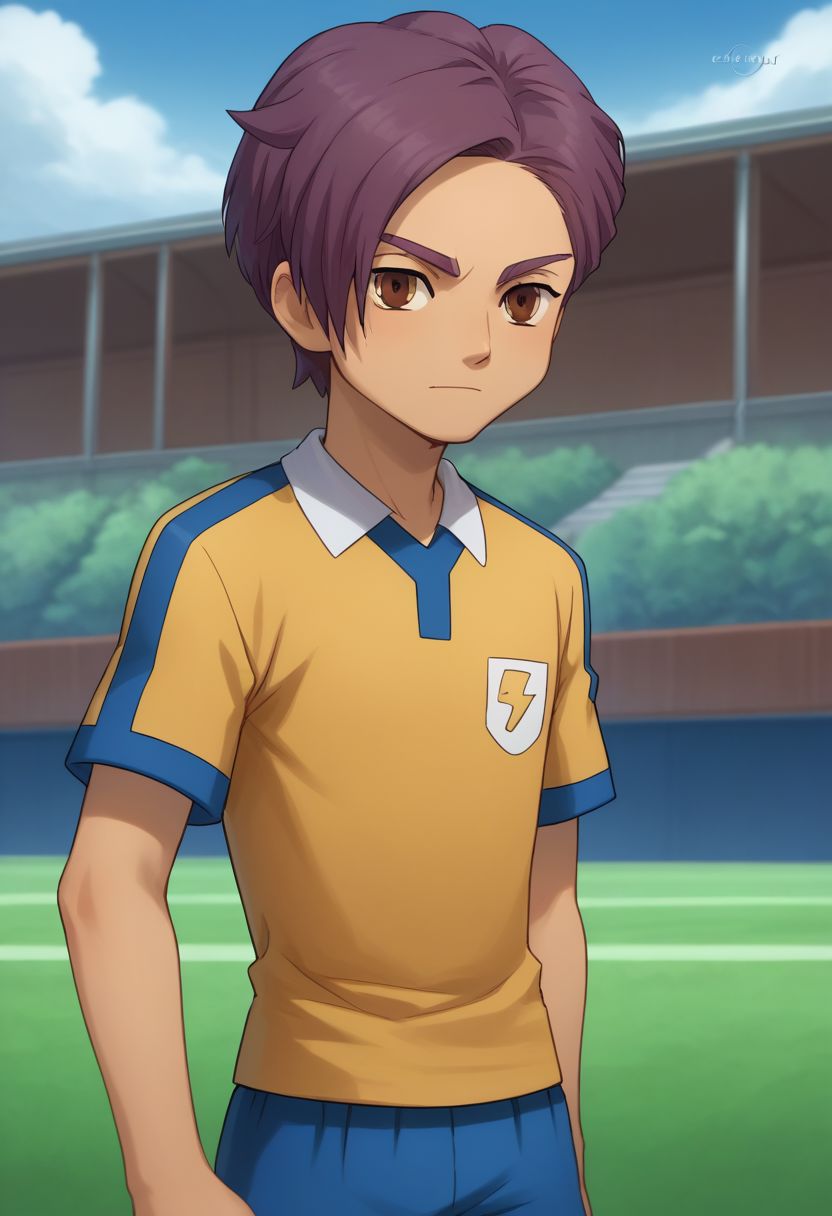 MinamAtsu, 1boy, male focus, solo, 棕色眼睛, 紫色头发, 雷门足球服, 上衣, 黄色上衣, 短袖, 闪电标志, 短裤, 蓝色短裤, 袜子, 蓝色袜子, 鞋子, 运动鞋,