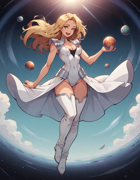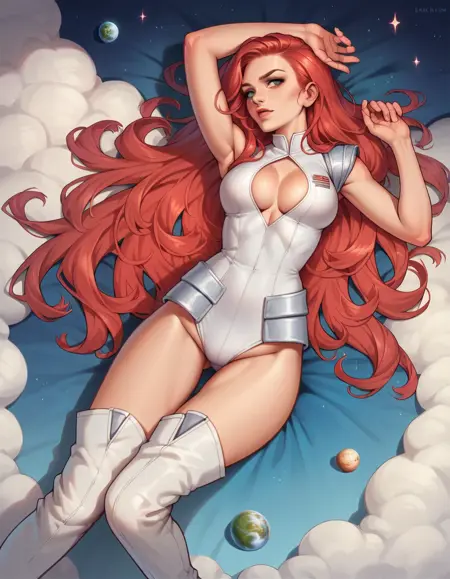 키워드: hud_astrnaut, 민소매 레오타드, 흰색 허벅지 부츠, 가슴 절개