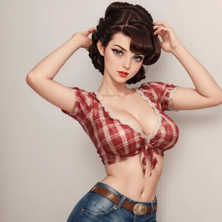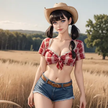 关键词:hud_cwgrl,牛仔,短裤,牛仔帽,靴子,乳房,腰部,银色腰带,格子短袖露脐上衣