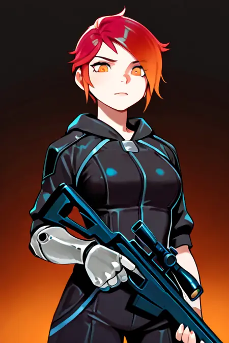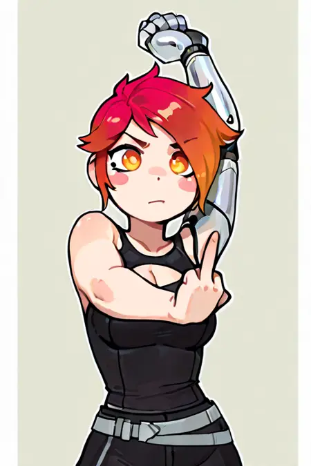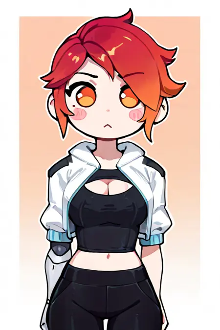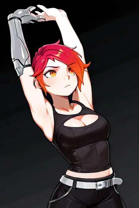 Belle Fontiere, Gradient Hair, Red Hair, Orange Hair, Orange Eyes, Single Mechanical Arm, White Jacket, Black Croptop, Cleavage Cutout, Black Pants