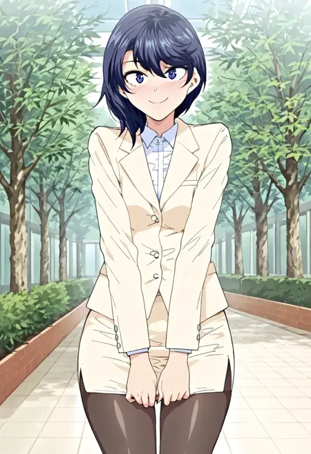 1. ((정식, 오피스 레이디, 베이지색 정장 자켓, 흰색 셔츠, 베이지색 연필 스커트, 흑색 팬티스토크, )) 흰색 가방,