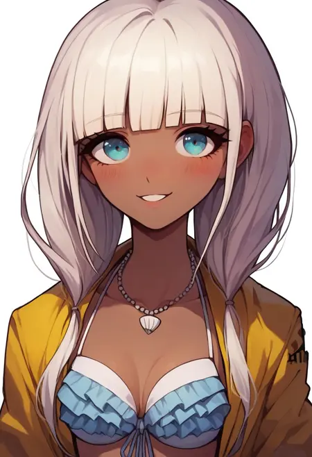 Angie Yonaga, Dark skin, White hair, twintails, blue eyes, pink blush on cheeks, bikini top, yellow jacket, necklace, navel, light blue skirt, bracelet, shoes