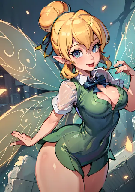 叮当小仙女 是来自《彼得·潘》的著名 迪士尼 角色。为获得更高精度,请使用 关键词 “(TinkerWaifu)”,我同样推荐使用关键词(单束发髻)、(无肩绿色长裙)、(仙女翅膀)来唤起她标志性的装扮。