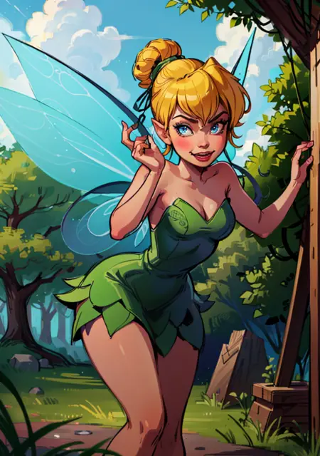 叮当小仙女 是来自《彼得·潘》的著名 迪士尼 角色。为获得更高精度,请使用 关键词 “(TinkerWaifu)”,我同样推荐使用关键词(单束发髻)、(无肩绿色长裙)、(仙女翅膀)来唤起她标志性的装扮。