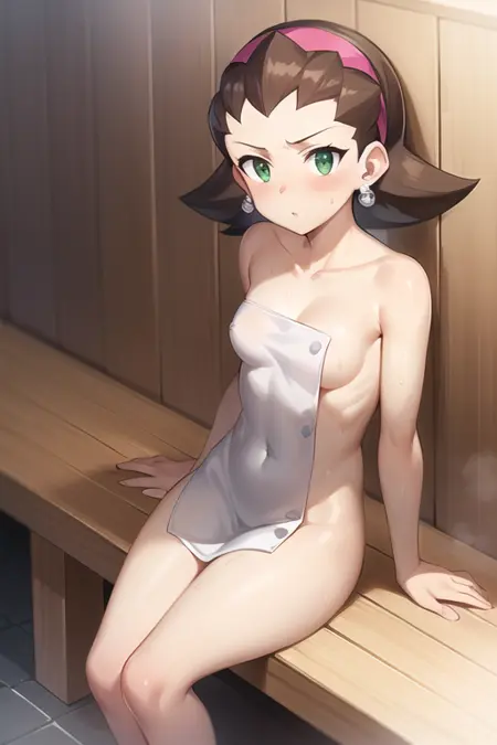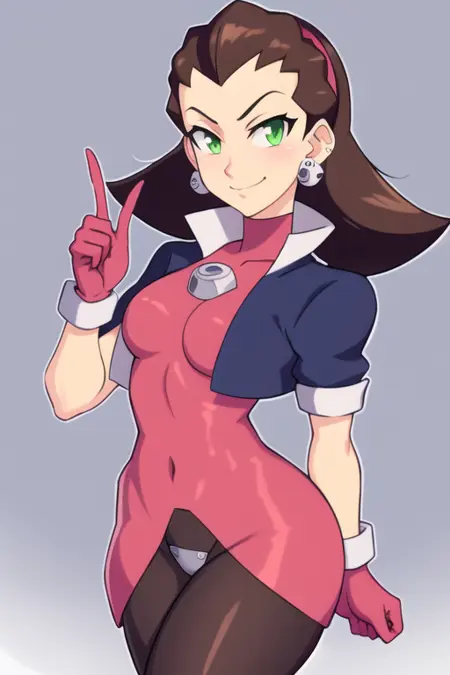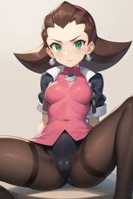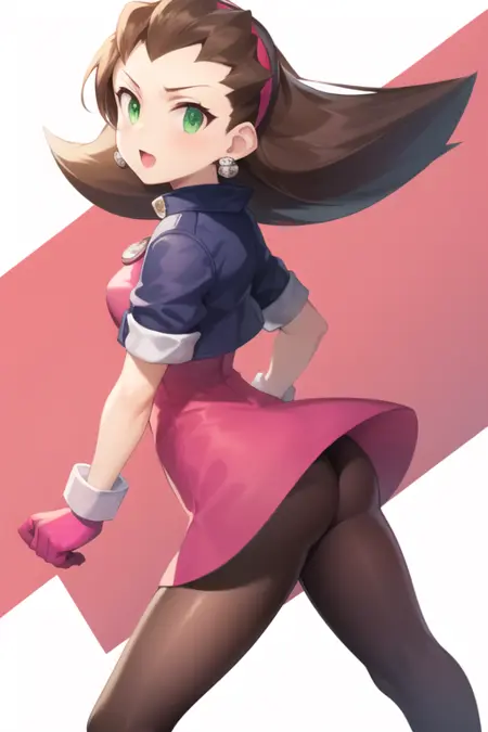 緑の目、茶髪、手袋、ピアス、ヘアバンド、ジュエリー、ショートジャケット、タイツ、ピンクの手袋、後ろめに髪を寄せたスタイル