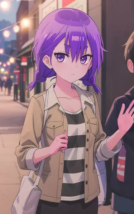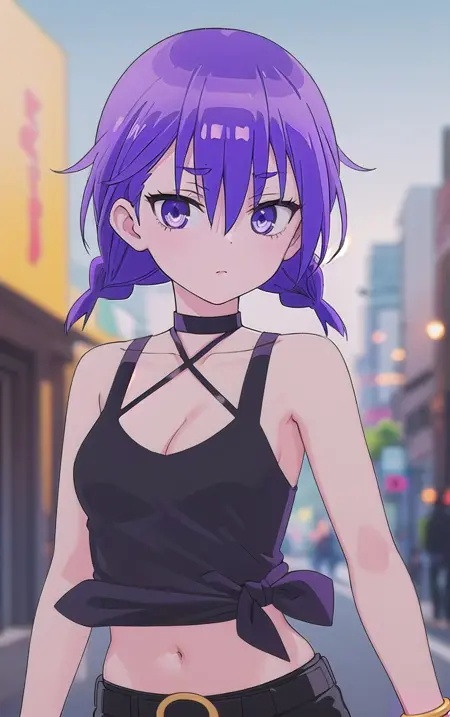 1girl, 紫色头发, 紫色眼睛, 短发, 双马尾辫, 发丝遮眼, 双辫子, 胸部, 小胸,