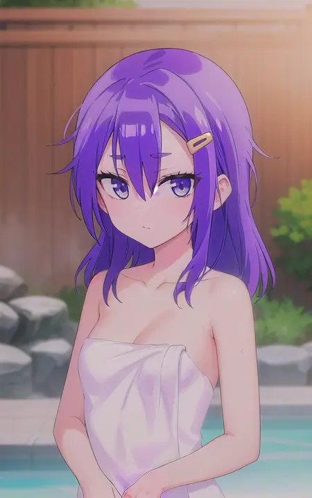 1girl, 紫色头发, 紫色眼睛, 发夹, 长发, 发丝遮眼, 胸部, 小胸, 锁骨,