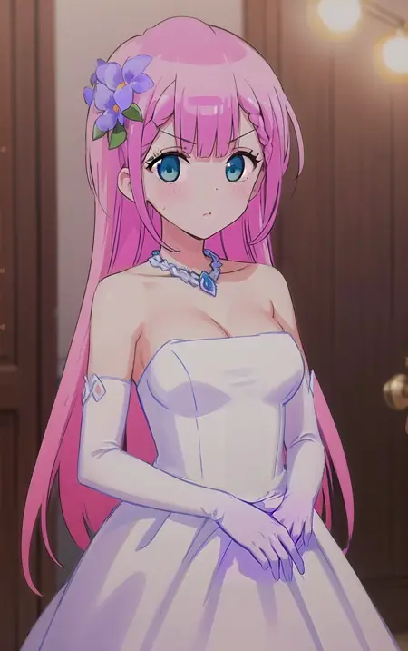 1girl, pink hair, blue eyes, long hair, bangs, breasts, hair ornament, medium breasts, hair flower, necklace, very long hair,