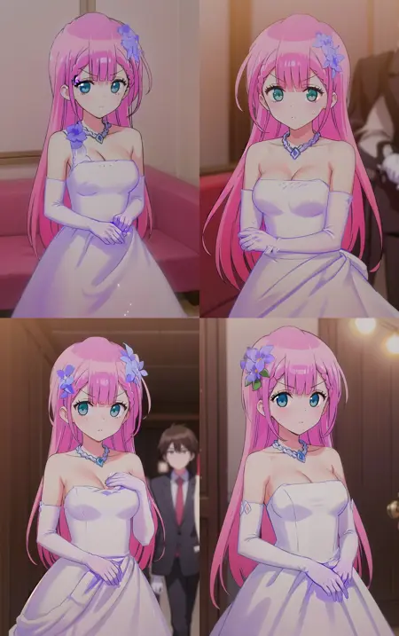 wedding dress, white dress, bare shoulders, white gloves, elbow gloves, cleavage, bride,