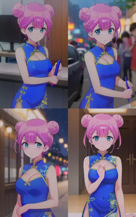 1girl, pink hair, blue eyes, double bun, hair bun, bangs, short hair, medium breasts, breasts, braid,