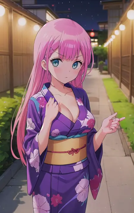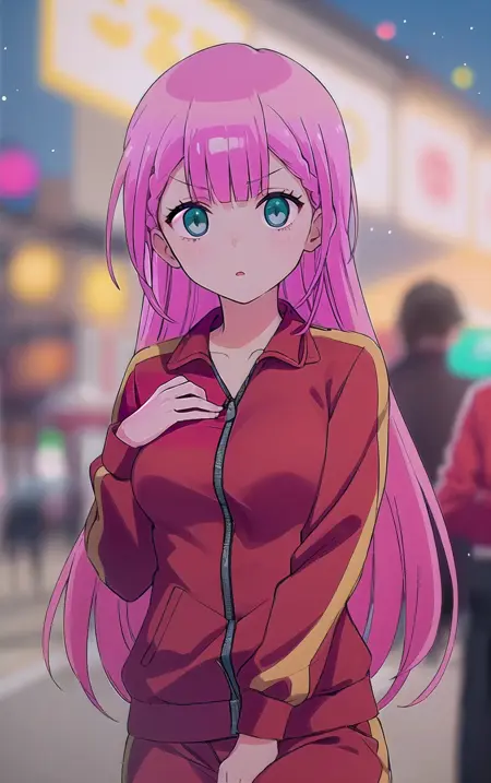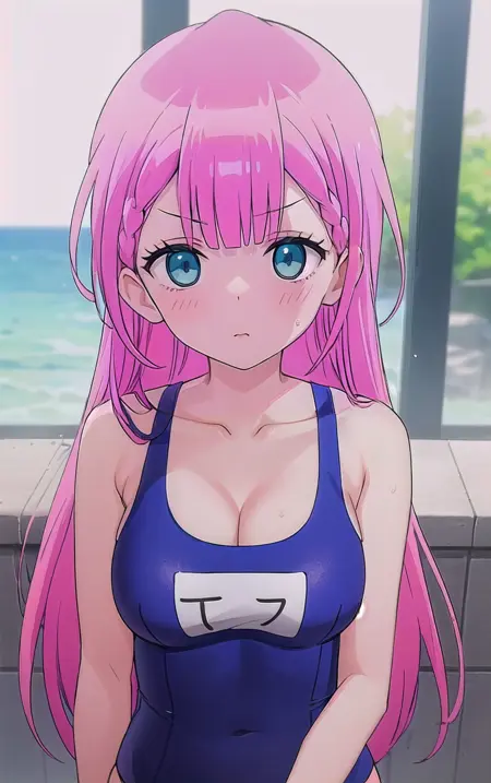 1girl, pink hair, blue eyes, long hair, bangs, medium breasts, breasts,