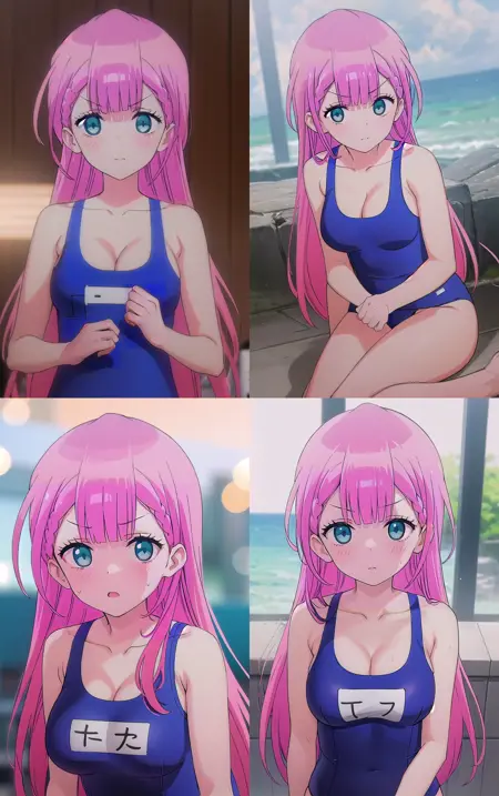 1girl, pink hair, blue eyes, long hair, bangs, breasts, medium breasts,