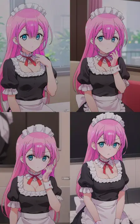 1girl, pink hair, blue eyes, long hair, maid headdress, bangs, medium breasts, breasts, hair between eyes,