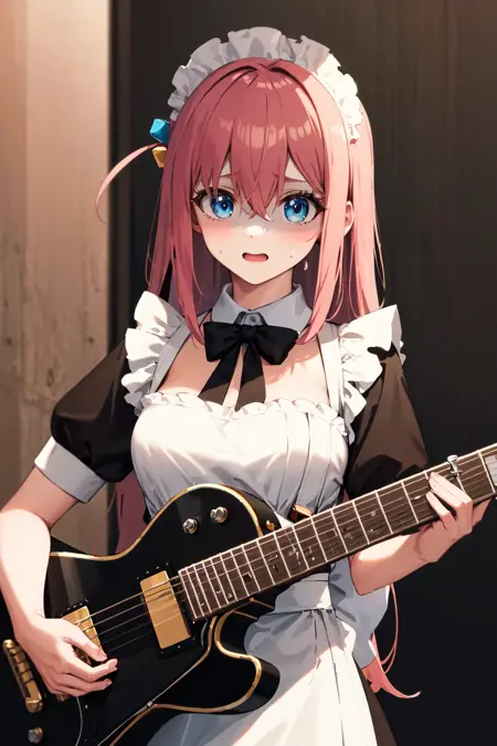 gotou1, gotou hitori, solo, bangs, hair between eyes, short sleeves, maid, maid headdress, medium breasts+ shaded face