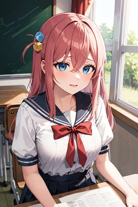 gotou1, gotou hitori, solo, bangs, hair between eyes, short sleeves, school uniform, skirt, shirt, sailor collar, medium breasts+ shaded face