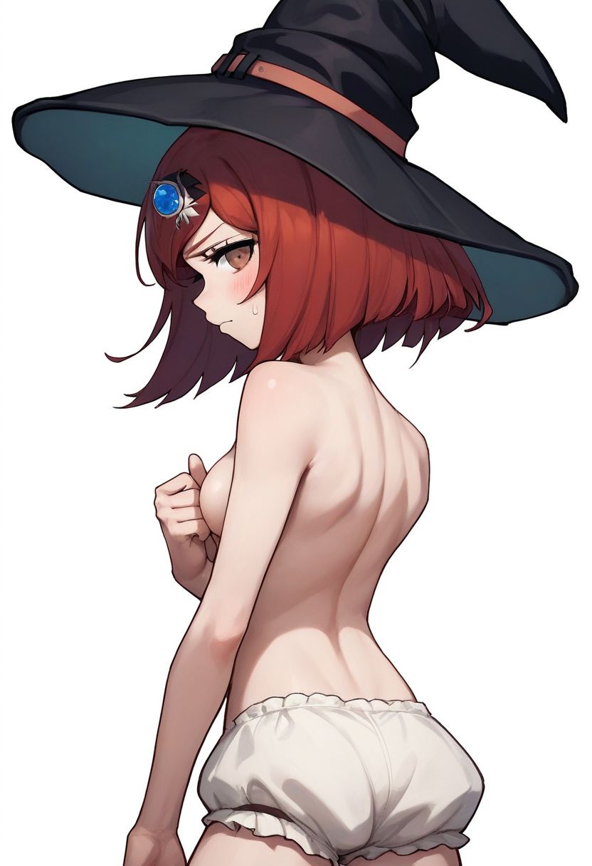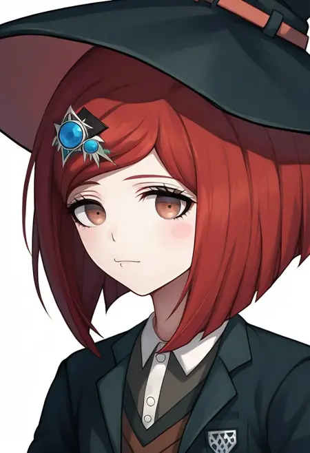 Himiko Yumeno, red hair, hair ornament, short hair, brown eyes, blush stickers, witch hat, jacket, vest, shirt, pleated skirt, pantyhose, boots
