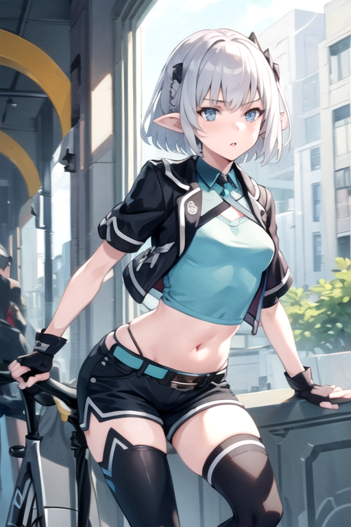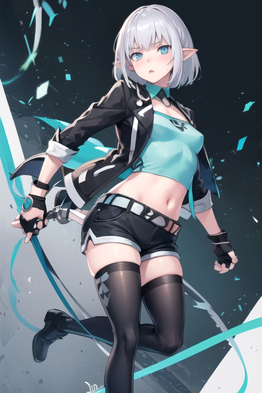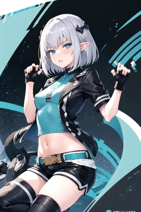 ElmaSp4ceMerc, 1girl, solo, short hair, blue eyes, aqua shirt, thighhighs, black gloves, navel, medium breasts, black jacket, grey hair, pointy ears, midriff, belt, shorts, fingerless gloves,