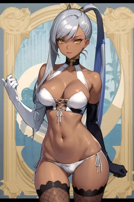 | トレーニングワード | VillettaNuSw1m, 1girl, solo, long hair, large breasts, thighhighs, elbow gloves, navel, cleavage, panties, yellow eyes, ponytail, grey hair, bikini, midriff, dark skin, dark-skinned female, white bikini, fishnets, side-tie panties, fishnet thighhighs, lowleg bikiniコピーしました! |