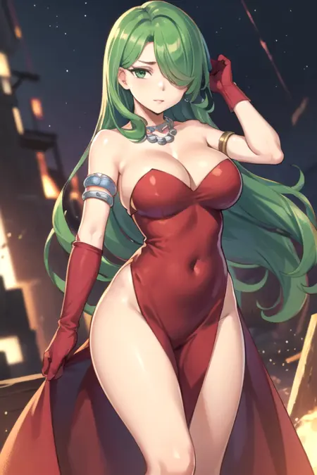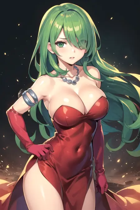 ReinaRave, 1girl, solo, very long hair, large breasts, elbow gloves, red dress, cleavage, bare shoulders, jewelry, green eyes, green hair, necklace, hair over one eye, strapless, armlet, red gloves