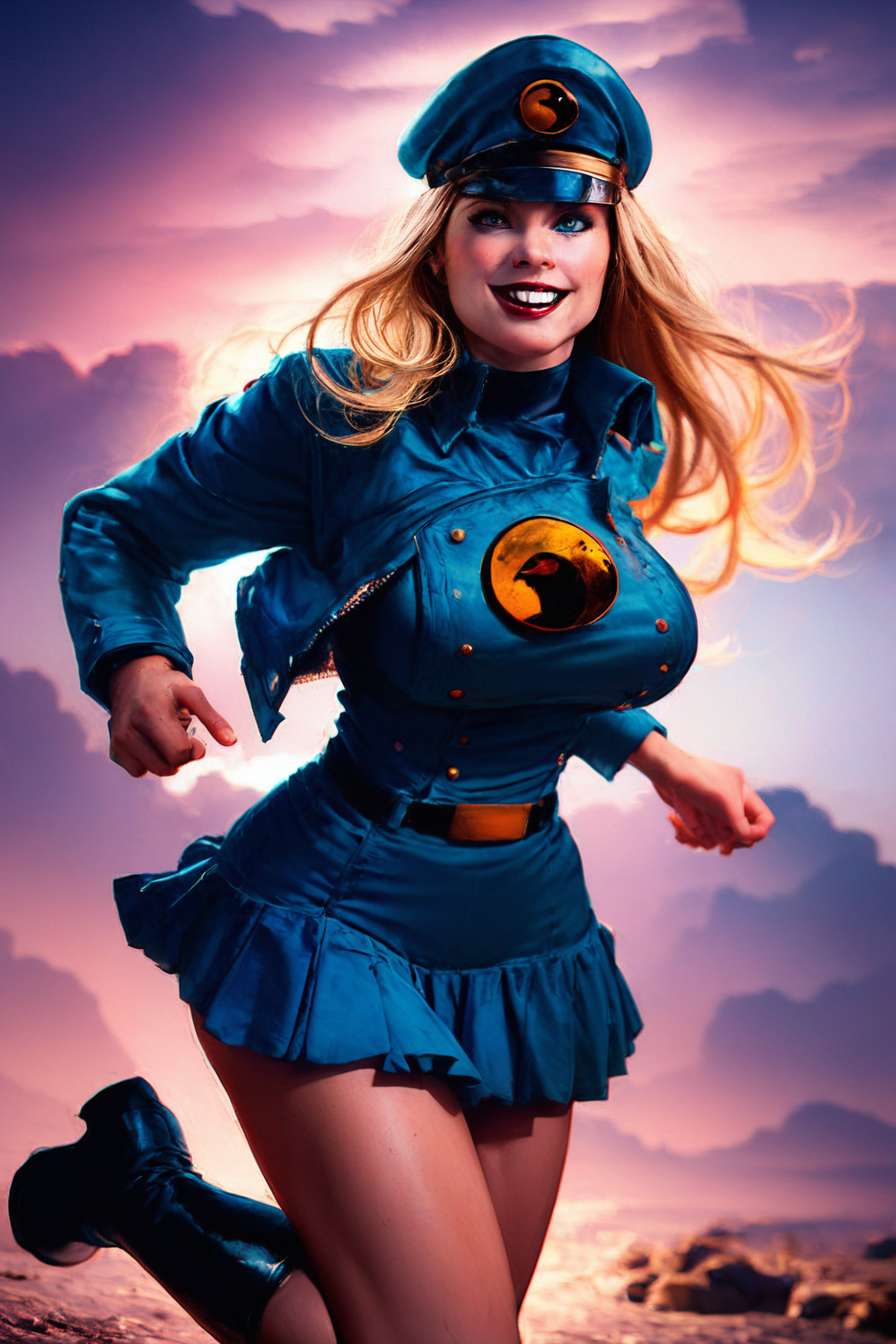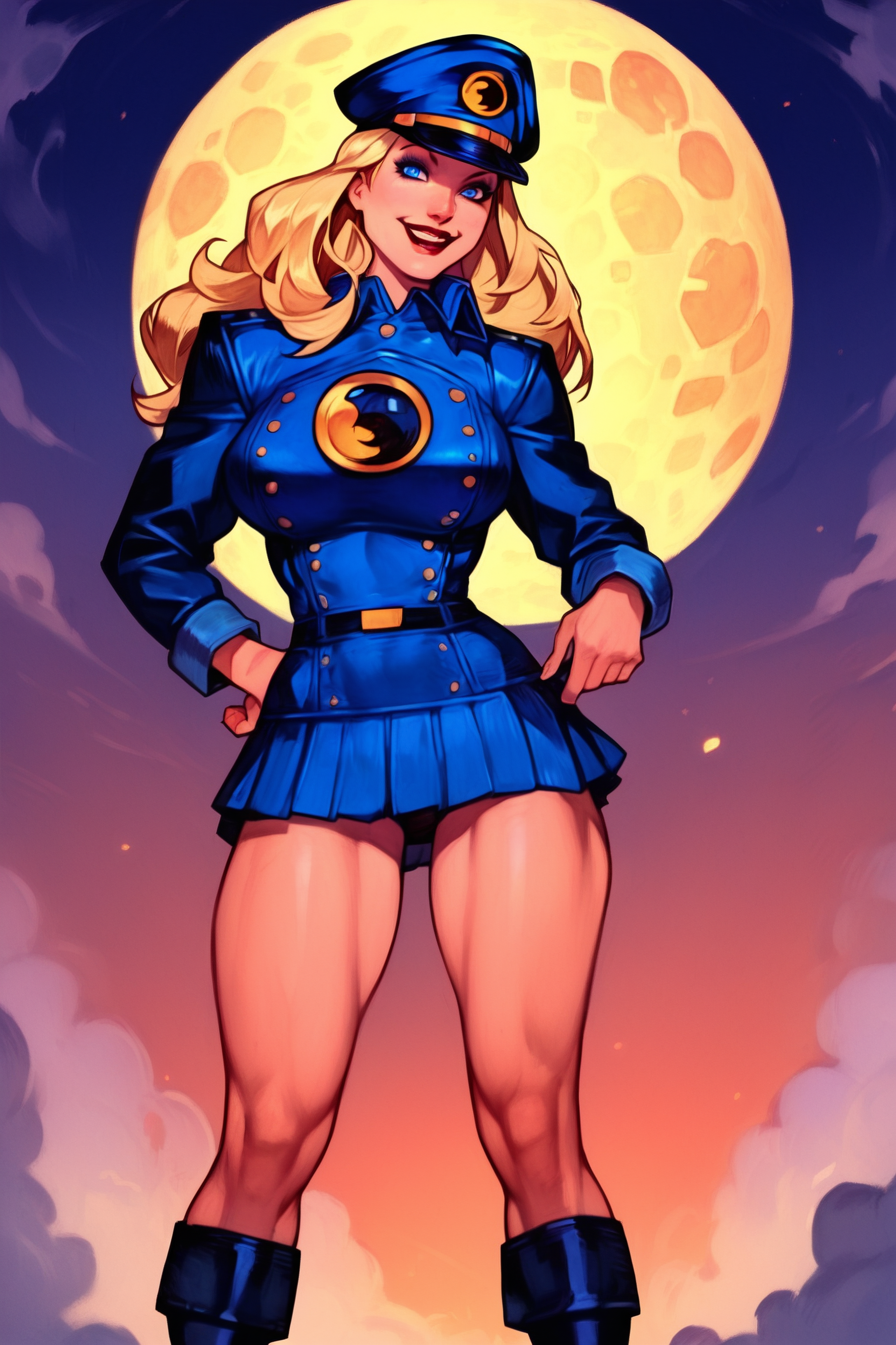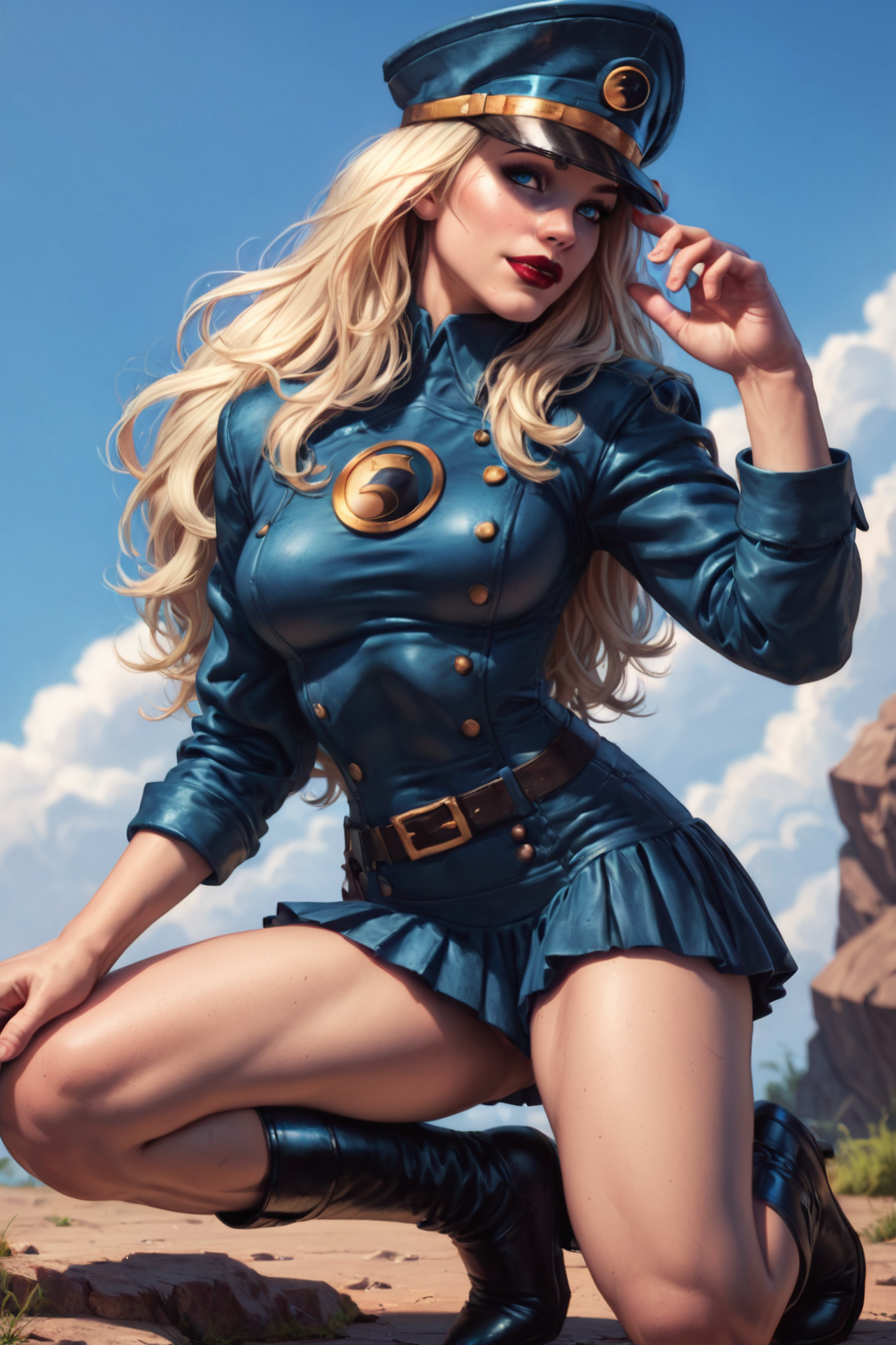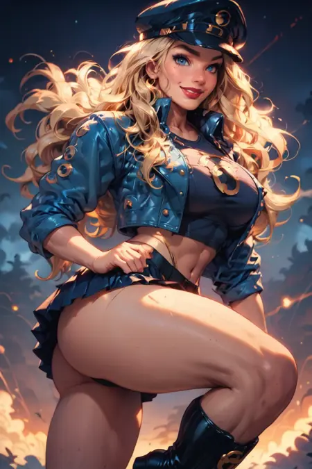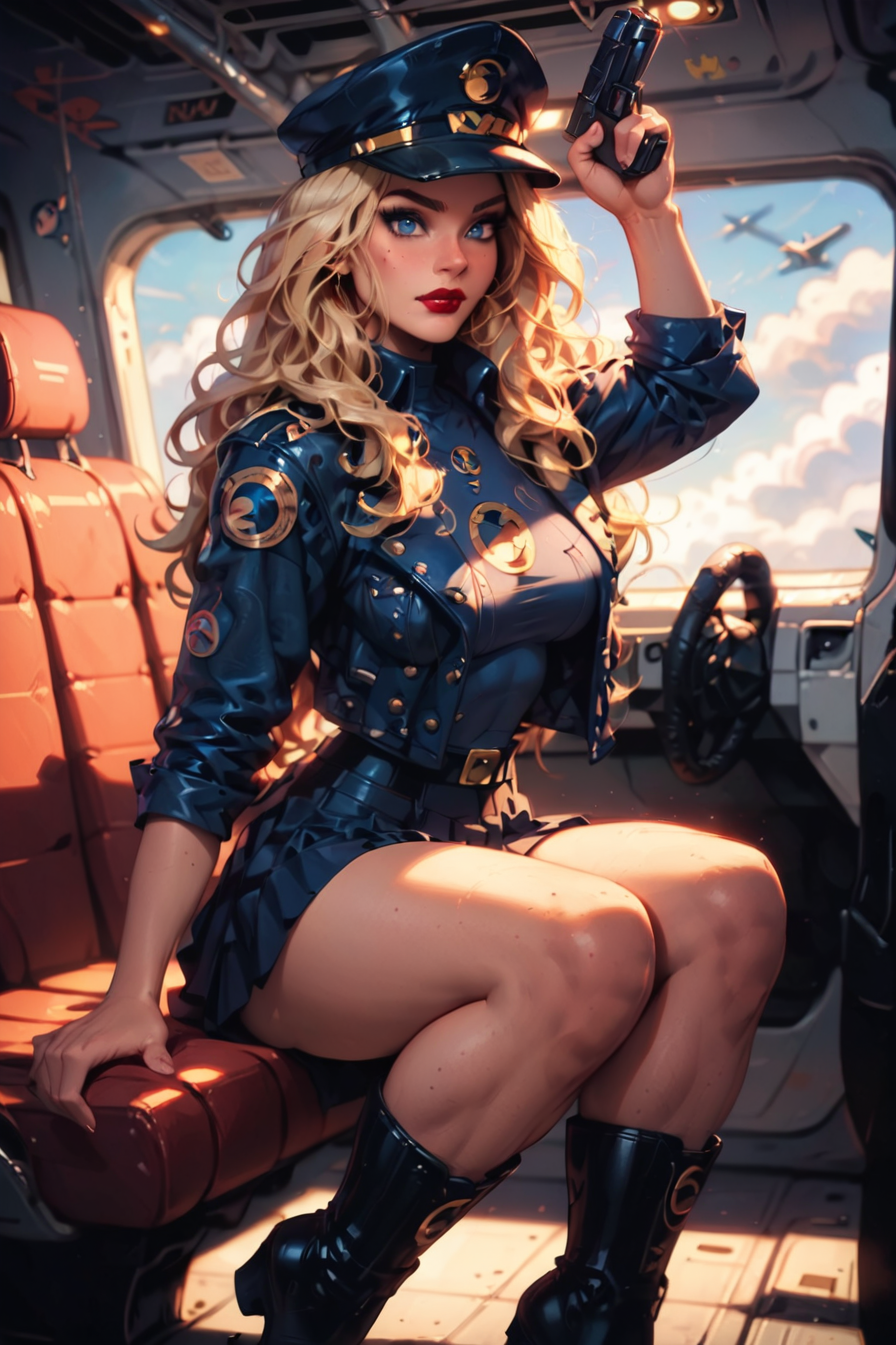 触发词:1girl,帽子,金色头发,裙子,长发,靴子,蓝眼睛,标志,制服,口红,妆容,黑色鞋履,夹克,乳房