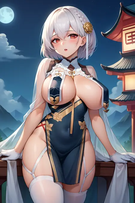 • 의상 3: 사이드 브레이드, 머리 장식, 중국 복장, 회색 드레스, 가슴 커튼, 골반 커튼, 가터 끈, 투명, 흰색 허벅지 양말, 흰색 장갑