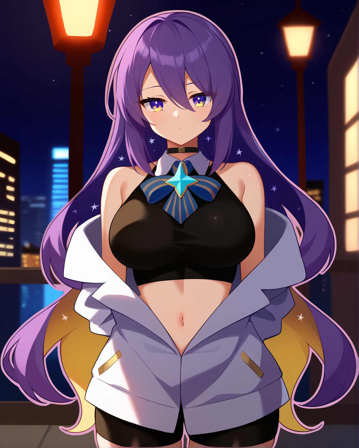 服装1(第一套) - moona, 1girl, solo, 长发, 金发, 大胸, 衬衫, 肚脐, 发丝遮眼, 裸露肩膀, 极长发, 紫色眼睛, 夹克, 黄色眼睛, 紫发, 多色发, 开襟服装, 短裤, 无袖, 项圈, 露脐, 蝴蝶结丝带, 露肩, 双色发, 露脐上衣, 黑色衬衫, 无袖上衣, 渐变发色, 黑色项圈, 黑色短裤, 白色夹克, 运动短裤