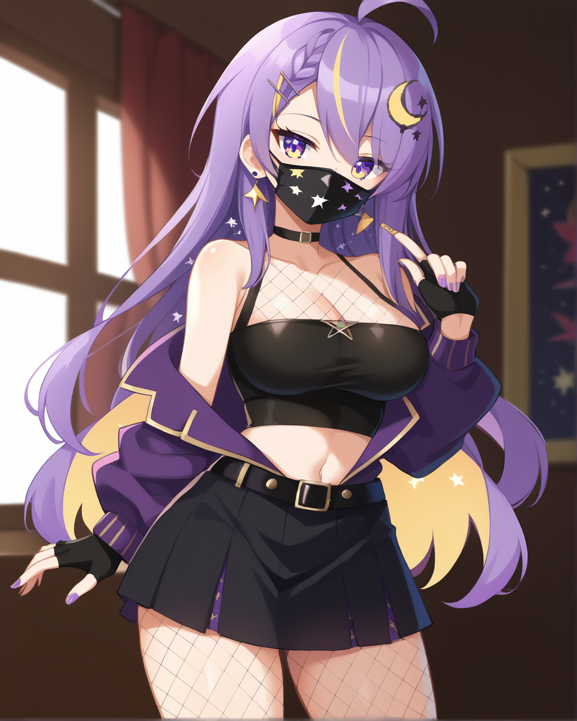 服装3(朋克摇滚装) - moona, 1girl, solo, 长发, 裙子, 头饰, 手套, 肚脐, 深V领, 饰品, 紫色眼睛, 夹克, 黄色眼睛, 紫发, 天线发, 丝袜, 多色发, 耳环, 黑色手套, 露脐, 无指手套, 黑色短裙, 露肩, 星星\(符号\), 指甲油, 衣服镂空, 面具, 鱼网袜, 黑色腰带, 内层发色, 口罩, 紫色指甲, 鱼网丝袜, 夹克部分脱下