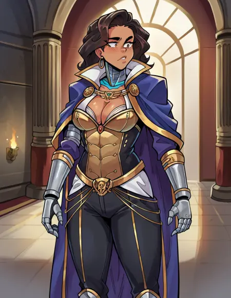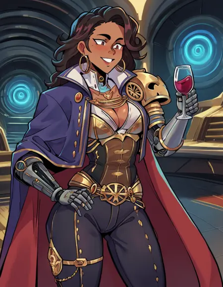 ローグトレーダーのジェイが馬上に。プロンプトは「JaeRT」、彼女のデフォルトのゲーム内衣装には「アーマー、胸元、肩アーマー、マント、片方の機械腕」が推奨されます。