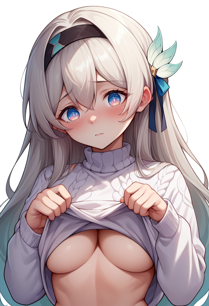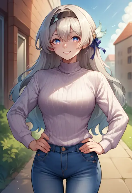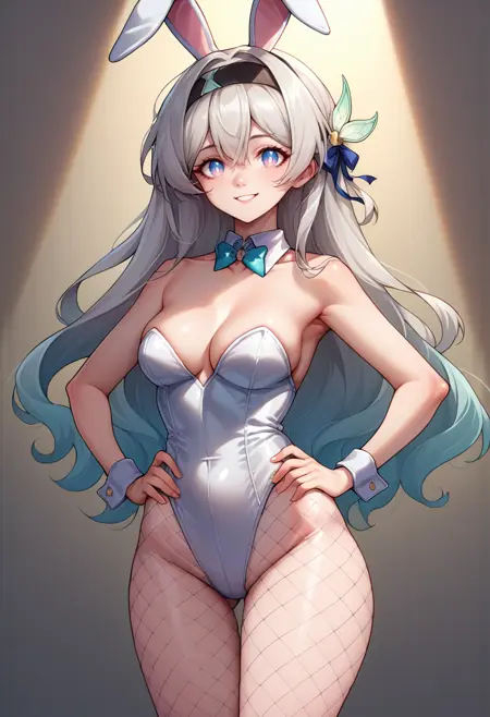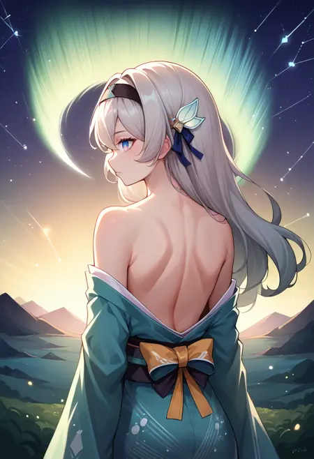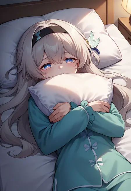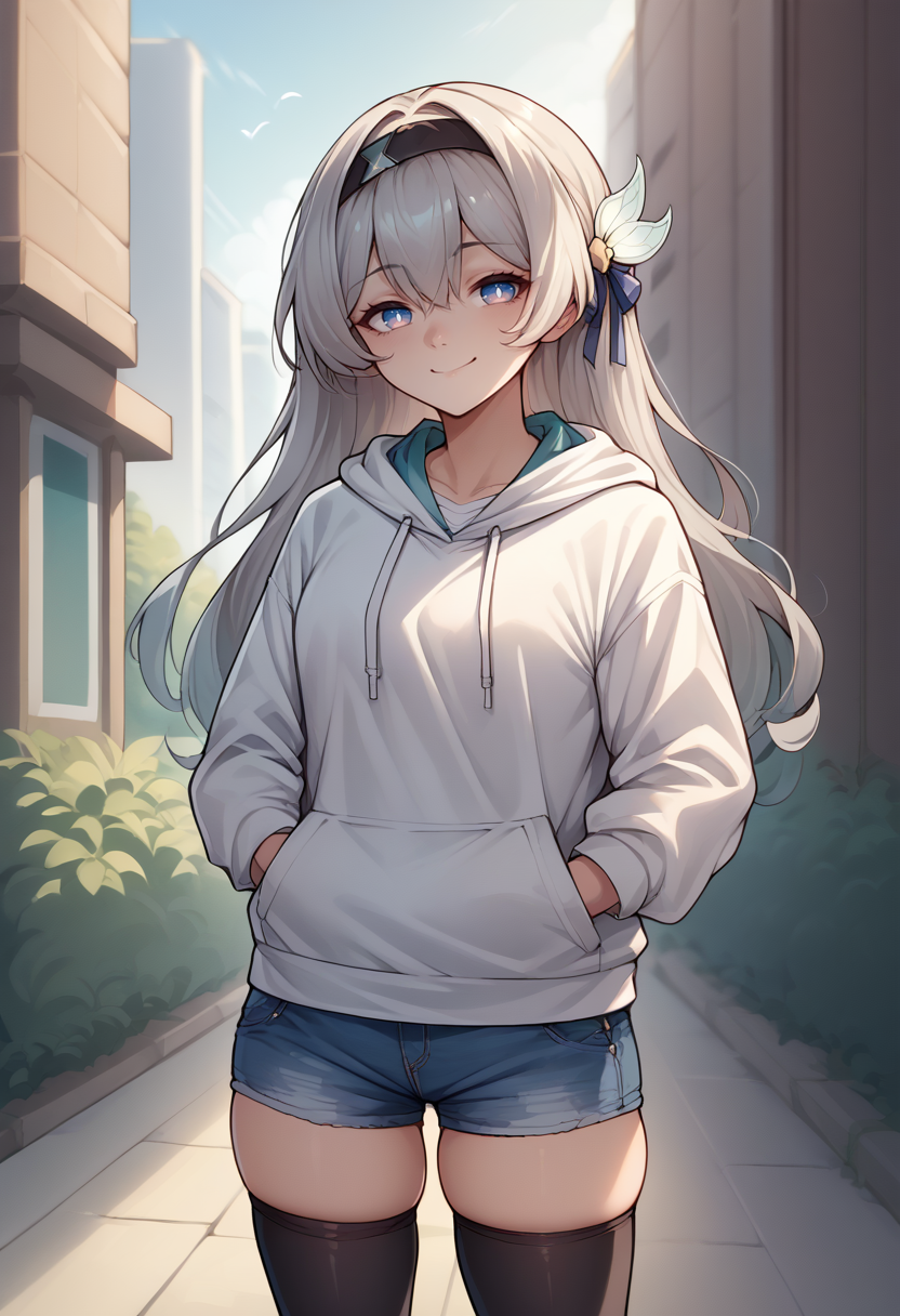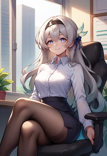 FireflyHSR, blue pupils, long hair, black hairband, hair ornament