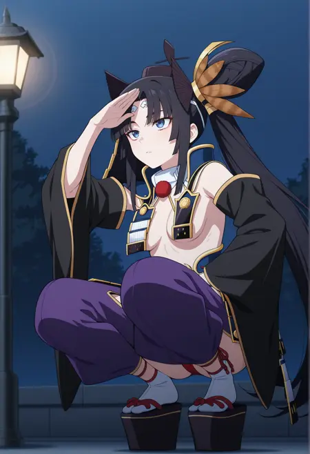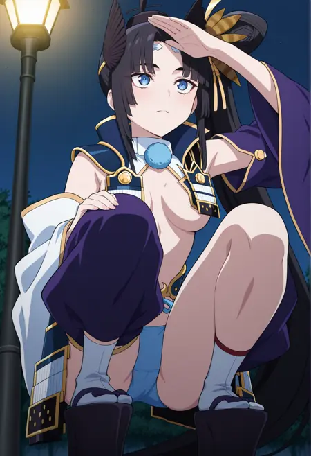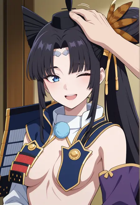 显著标签:黑发,极长发,蓝眼,发髻,侧马尾,头环,发饰,头翼,羽毛,帽子,暴露服装,可拆卸衣领,和服,日本铠甲,露乳沟,露侧乳,可拆卸袖子,不对称服装,不对称袖子,蓝色内裤,护腿,厚底鞋