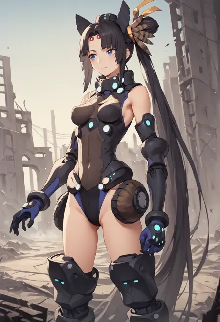 주요 태그: 검은 머리카락, 매우 긴 머리카락, 파란 눈, 머리 땋기, 옆머리 단발, 머리장식, 헤드 윙, 깃털, 모자, 노출된 옷, 분리된 칼라, 일본복, 일본 갑옷, 언더부브, 사이드부브, 분리된 소매, 비대칭 옷, 비대칭 소매, 파란색 팬티, 차프스, 플랫폼 신발